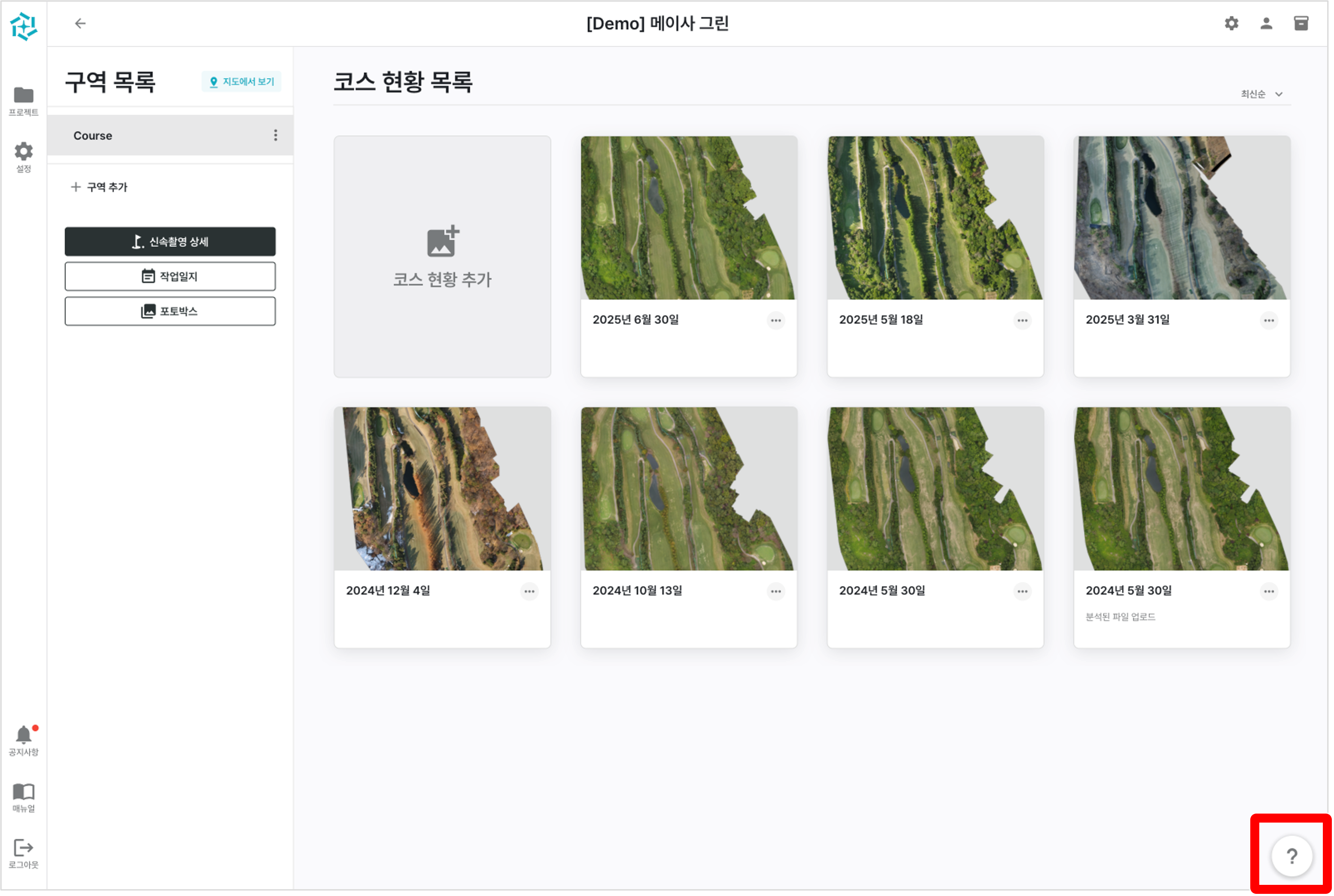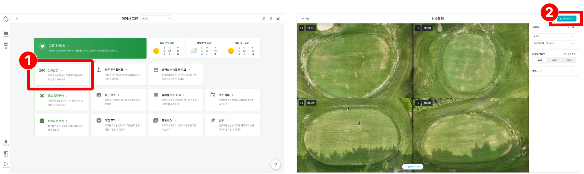 신속촬영은 골프장 내 주요 지점을 드론으로 빠르게 촬영하여, 정사사진보다 훨씬 짧은 시간 안에 고해상도 이미지를 확인할 수 있는 기능입니다.