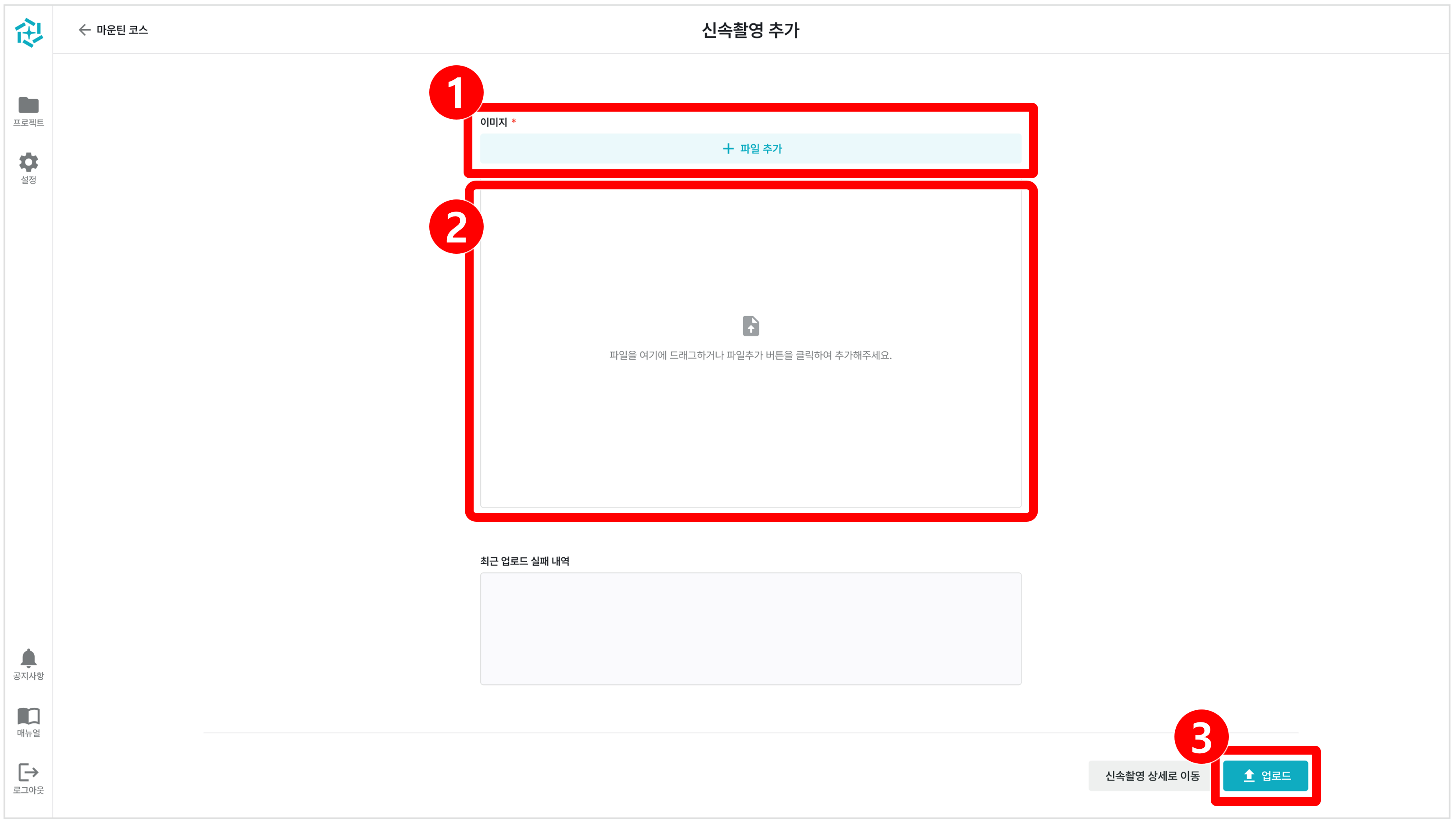 ② 또는, 신속촬영 상세 화면에서 업로드 버튼을 클릭하여 화면 이동합니다.