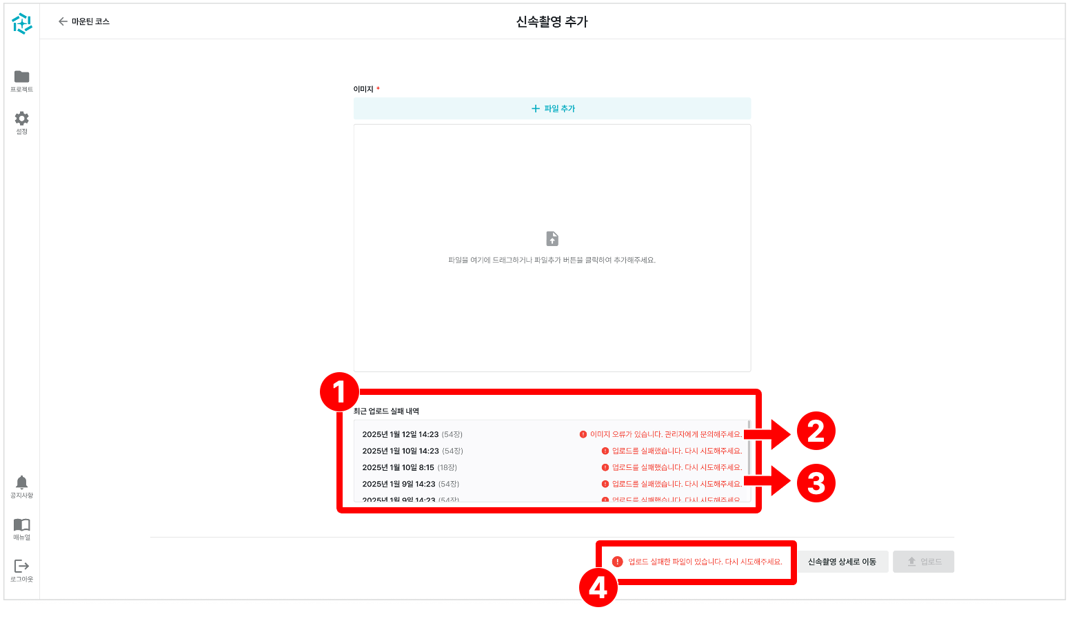 ① 최근 7일간 ‘신속촬영 업로드’ 실패 내역이 노출됩니다.